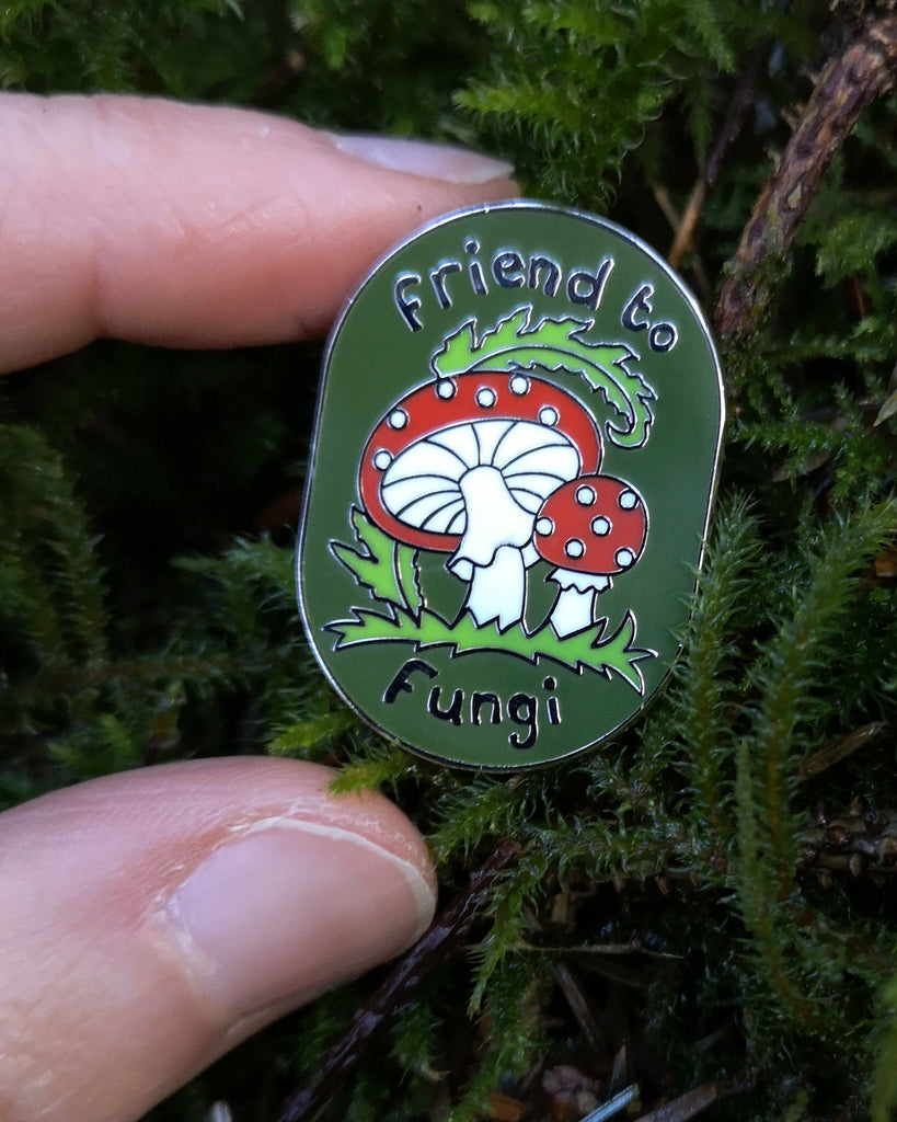 Designed and illustrated by Katie Green, the silver-plated copper pin has an enamelled design featuring fly agaric toadstools.